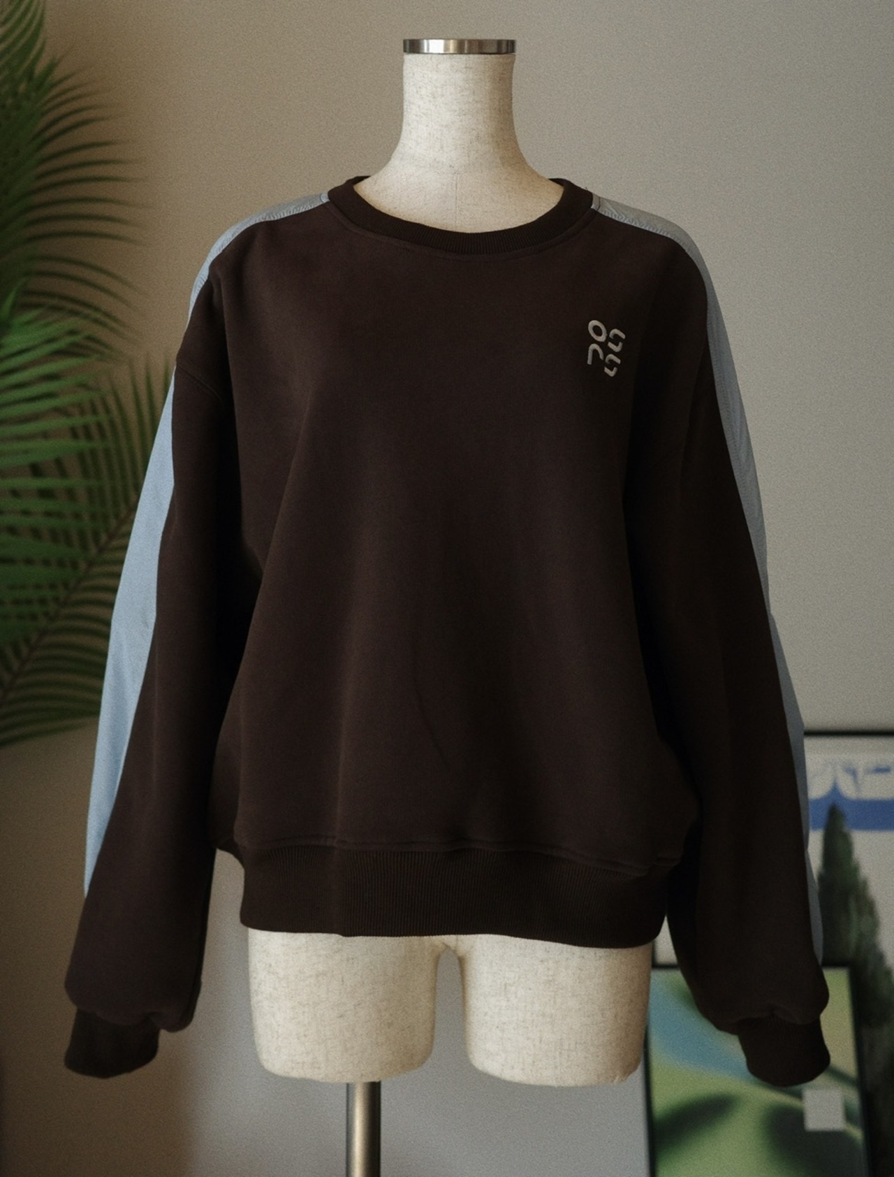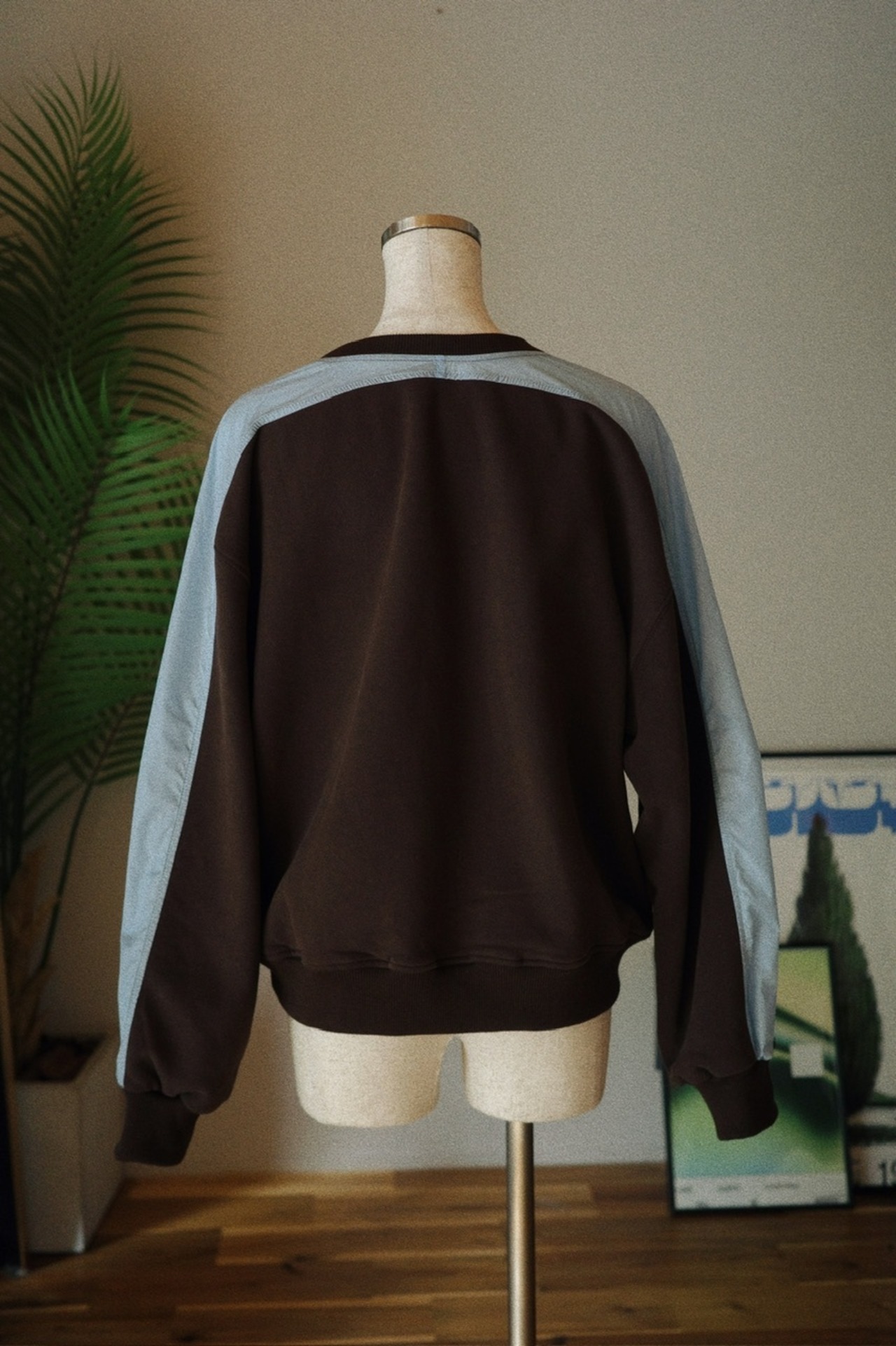 フロントは落ち着いたダークブラウン、肩から袖にかけて淡いブルーの異素材切り替えを施し、シンプルながら存在感のあるデザインに仕上げました。