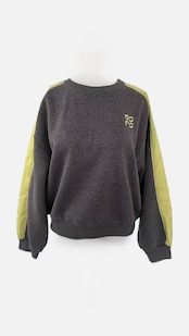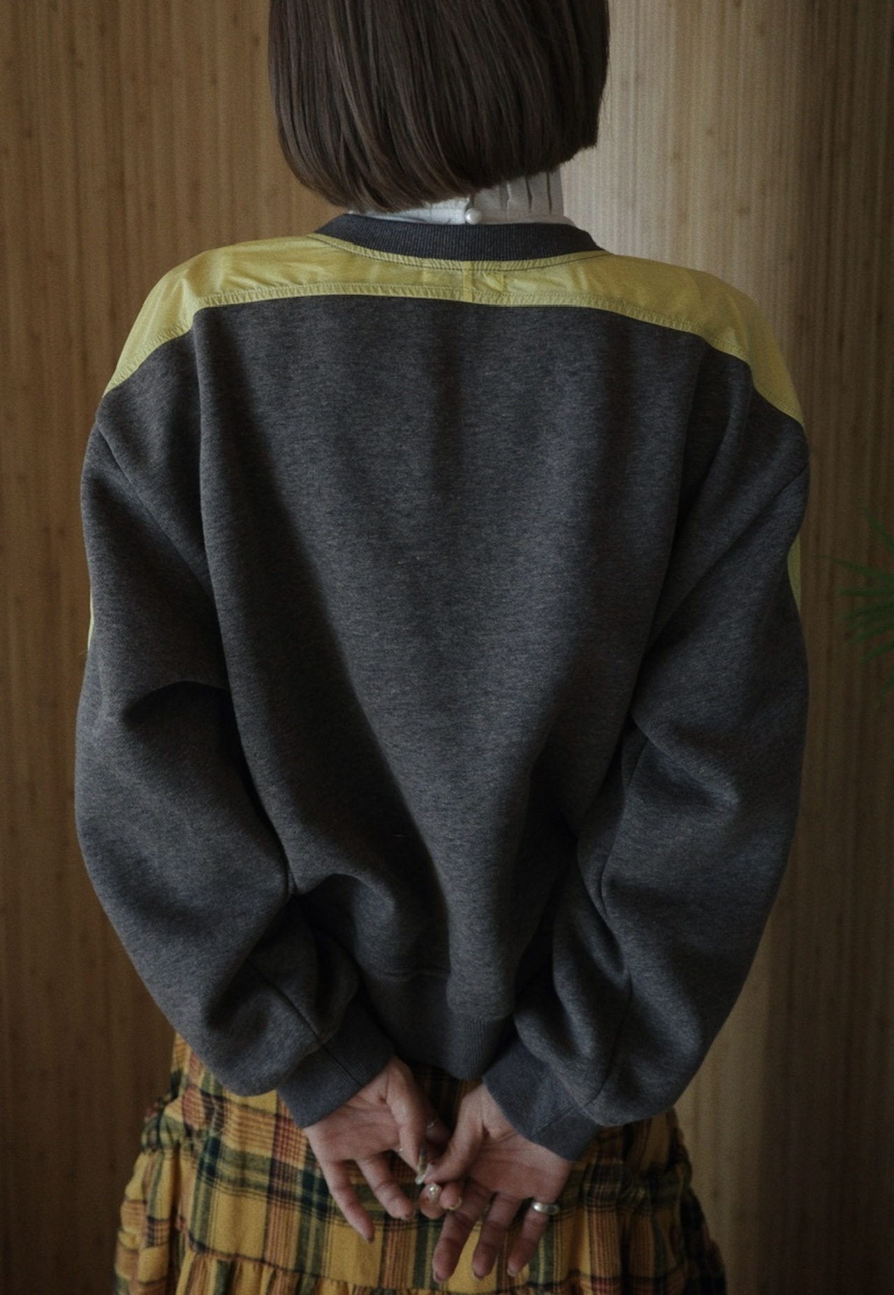 フロントは落ち着いたダークグレー、肩から袖にかけて淡いイエローの異素材切り替えを施し、シンプルながら存在感のあるデザインに仕上げました。